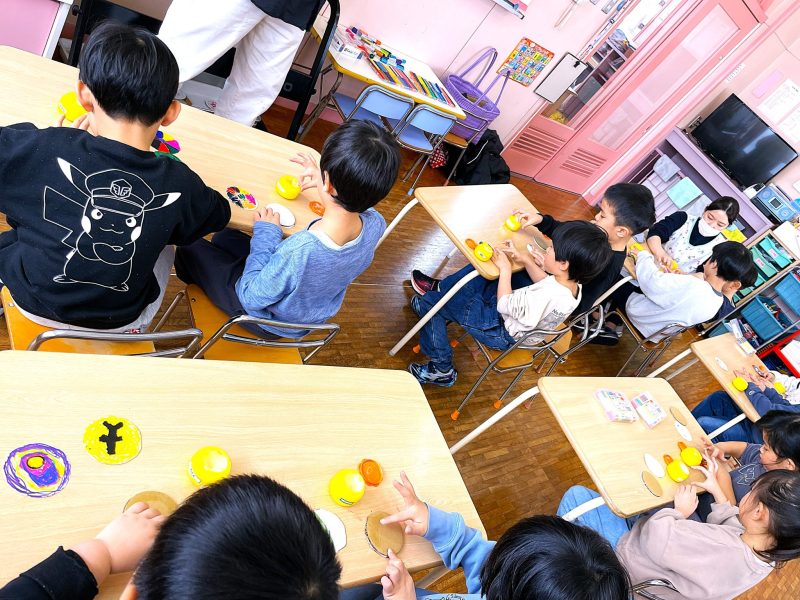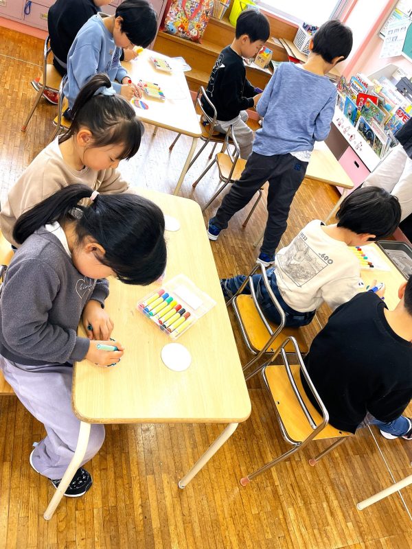 1月すみれ保育園出前授業で、ブンブンゴマ作りを行いました。