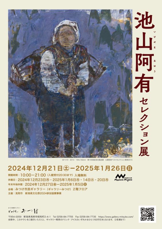終了 2階フロア 池山阿有セレクション展 会 期: 2024.12.21(土) - 2025.01.26(日) 時 間: 10:00ー21:00(入館受付は20:30まで) 休館日: 毎週月曜日(祝日の場合は翌平日) 2023年に逝去した見附市の洋画家池山阿有。見附市が所蔵する大作から20点をセレクションし、展示する。