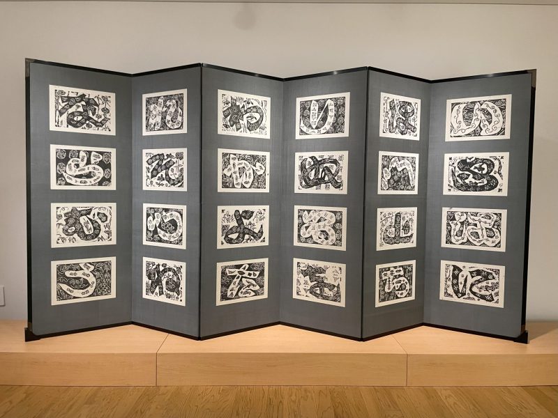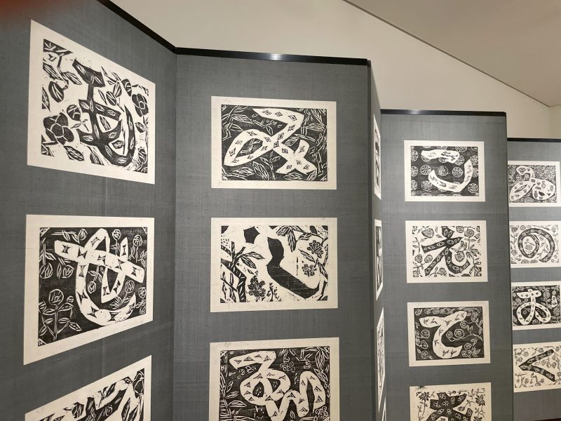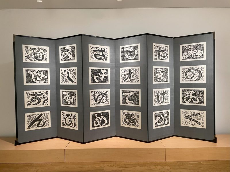 「いろは板画柵屏風」は、1952(昭和27)年毎日新聞社主催の第一回日本国際美術展に出品された、いろは四十八文字に「ん」を加えた仮名を一文字ずつ版画にし、屏風一扇(屏風の画面1枚)に四文字ずつ十二列に貼り交ぜた六曲一双屛風。(六枚の画面が六曲。一双は六曲の屏風が二枚ある形式をいう。)
