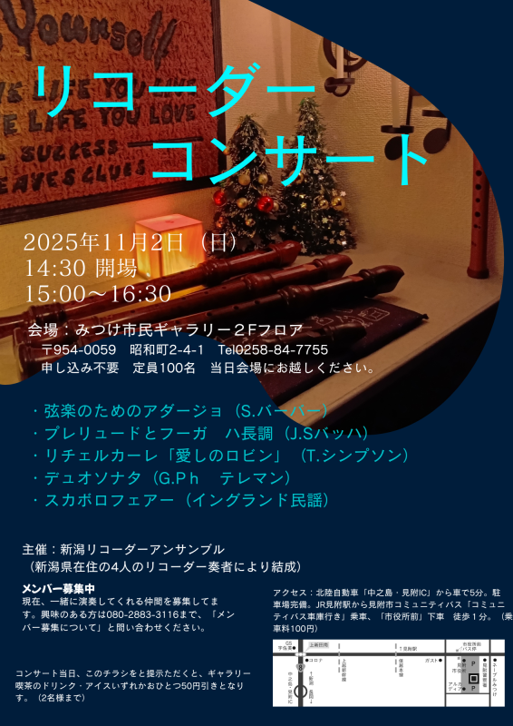開催予定 2階フロア リコーダーコンサート 会 期: 2025.11.02(日) - 2025.11.02(日) 時 間: 開場:14:30 公演:15:00~16:30 ギャラリー開館時間10:00ー20:00(入館受付は19:30まで) 休館日: 毎週月曜日 新潟県内で活動するリコーダー奏者たちによる演奏会を開催。 主催:新潟リコーダーアンサンブル