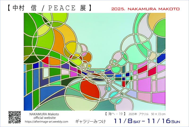 開催中 展示室2 中村信/PEACE展 会 期: 2025.11.08(土) - 2025.11.16(日) 時 間: 10:00ー20:00(入館受付は19:30まで) 最終日は16:00まで 休館日: 毎週月曜日 三条市在住画家の個展を開催。