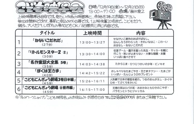 上映時間:13:00~17:00 お問い合わせ・お申込みはギャラリーにご来館かお電話をください。(0258-84-7755)