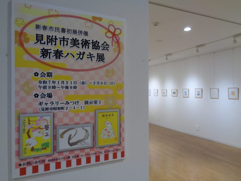 開催予定 展示室1 1/30~2/8 展示室1「第61回新春市民書初展併催展 見附市美術協会新春ハガキ展」 会 期: 2026.01.30(金) - 2026.02.08(日) 時 間: 10:00ー20:00(入館受付は19:30まで) 休館日: 会期中は無休 見附市美術協会魁夷による、新春ハガキ展を開催。書・絵画・版画・写真など。 昨年の展覧会の様子