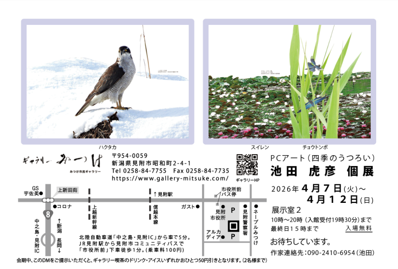 開催予定 展示室2 4/7~12展示室2「PCアート(四季のうつろい)池田虎彦個展 会 期: 2026.04.07(火) - 2026.04.12(日) 時 間: 10:00ー20:00(入館受付は19:30まで) 最終日は15:00まで 休館日: 毎週月曜日 見附市在住作家による、写真を加工したデジタルアートの展覧会を開催。