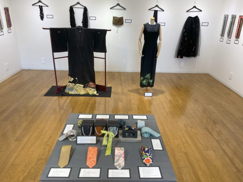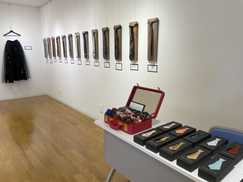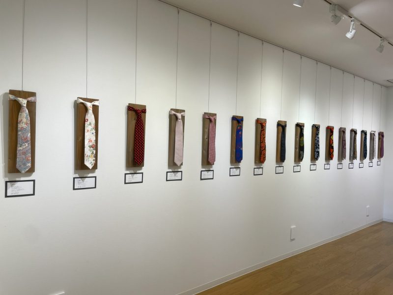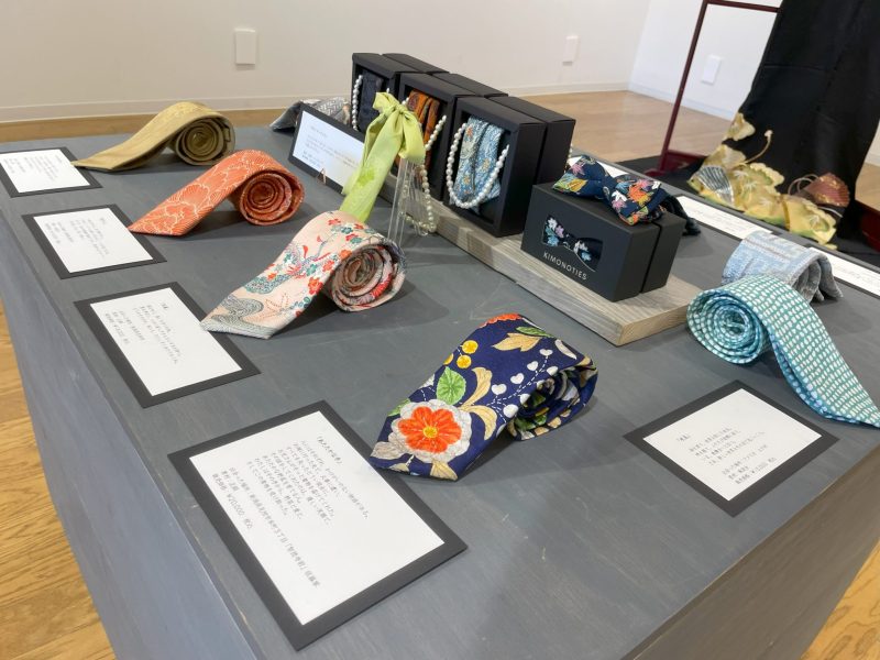見附市在住の服飾作家が作る着物で作るネクタイを中心に展示。